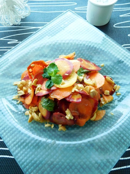 ミントでさわやかカラフル人参のサラダ ピーナッツ添え 2016年04月21日 カラフル人参を見つけました~ ニンジンていろいろな色があるんですね 黄色でしょ 赤人参 紫ニンジン そして普通のオレンジニンジン~ 紫ニンジンが 中が黄色くてかわいいので キャロット・ラペのように 千切りにせず で輪切り ... 続きを読む