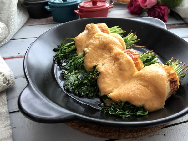 ④耐熱皿に並べ 明太子とマヨネーズを