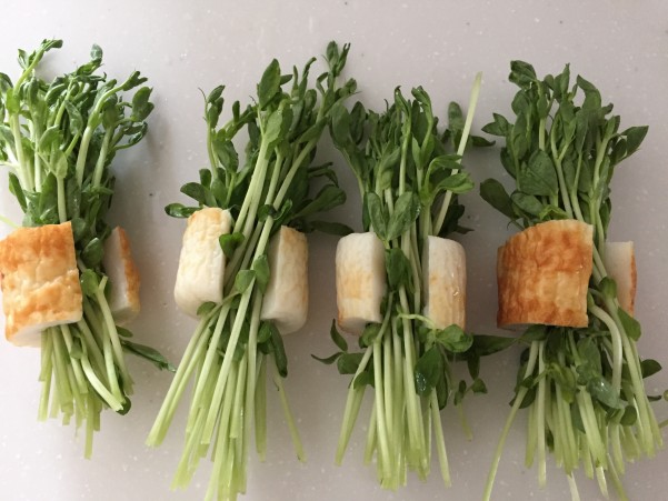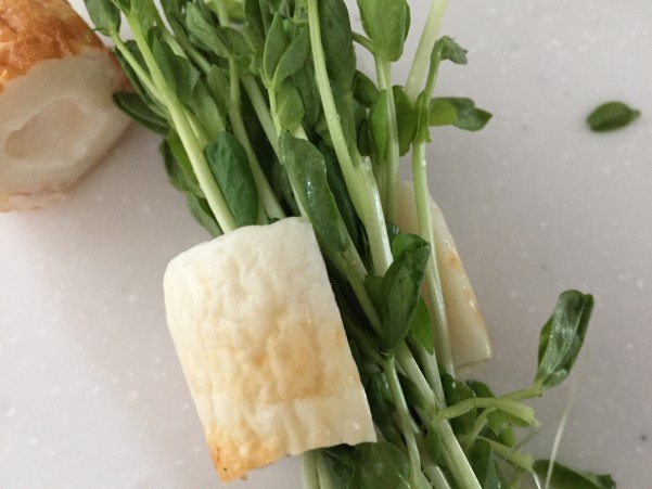 ③豆苗をちくわではさむ