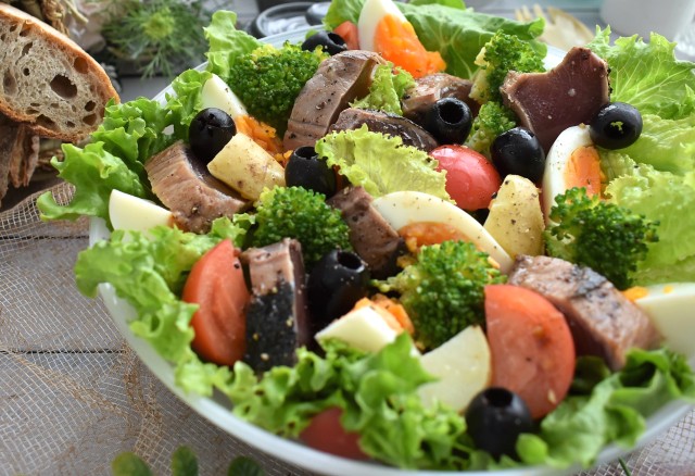 茹でたジャガイモ ブロッコリー トマトに黒オリーブ