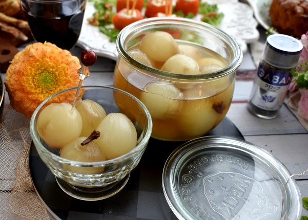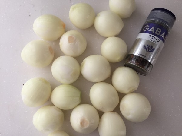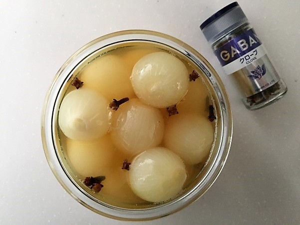 ワインヴィネガーとクローブで漬け込みます