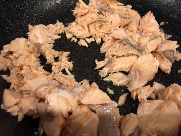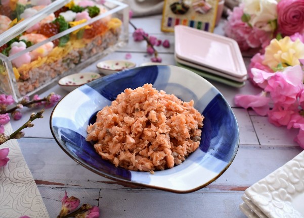 ③フライパンに ほぐした鮭を入れ弱火でくずしながら炒め 煮汁大さじ2と