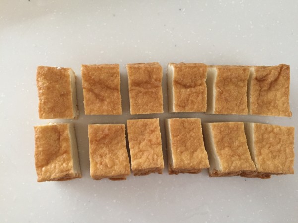 厚揚げは食べやすい大きさ 12等分に切ります