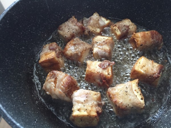 肉巻き厚揚げを カリッとするまで揚げていく・・・というか炒め揚げですね