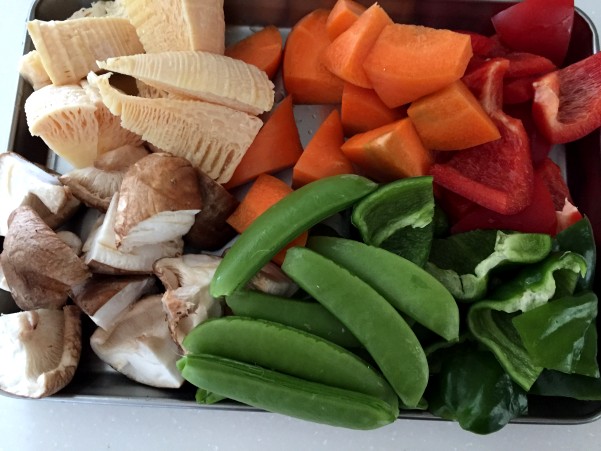 野菜は たけのこ 椎茸 人参 赤パプリカ ピーマン スナップエンドウ