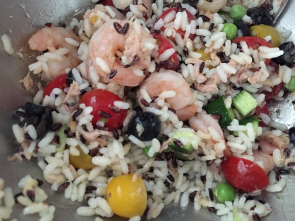 ②エビ グリンピースも茹で プチトマトは半分に切り きゅうりは小さな角切り