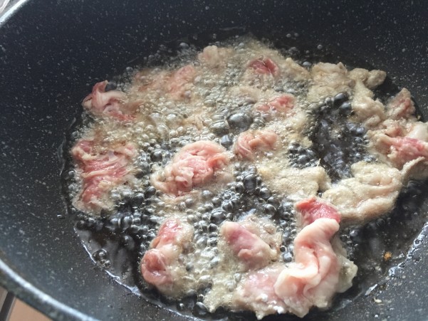 ②フライパンに揚げオイルを入れ 豚バラ肉をカリッとするまで揚げる