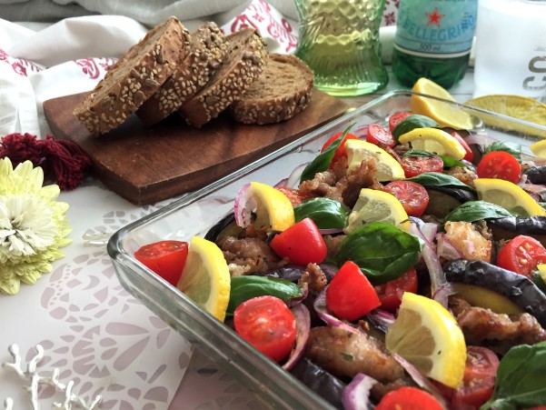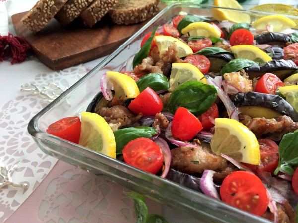 豚バラ肉となすをカリッと揚げて トマトと紫玉ねぎとともにマリネします