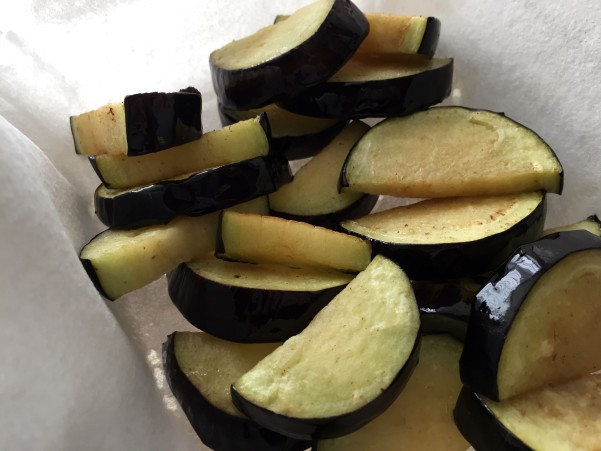③ナスは縦半分に切り くし切りにして 豚バラ肉を揚げたオイルで 素揚げする