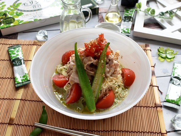 モリンガ青汁と豆乳で作った汁に 茹でたそうめんを盛りつけ