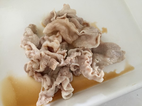 ③沸騰した湯で 豚しゃぶしゃぶ肉を湯がいてから 水気をしっかり切り