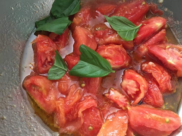 ③オリーブオイル大さじ1 ちぎったバジリコを加えトマトをくずさないように