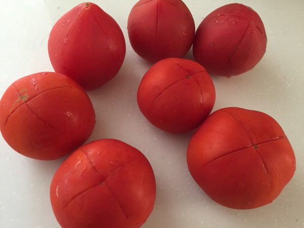 1個60~80gぐらいの中くらいの大きさのもので 湯むきをするので切り込みを入れます