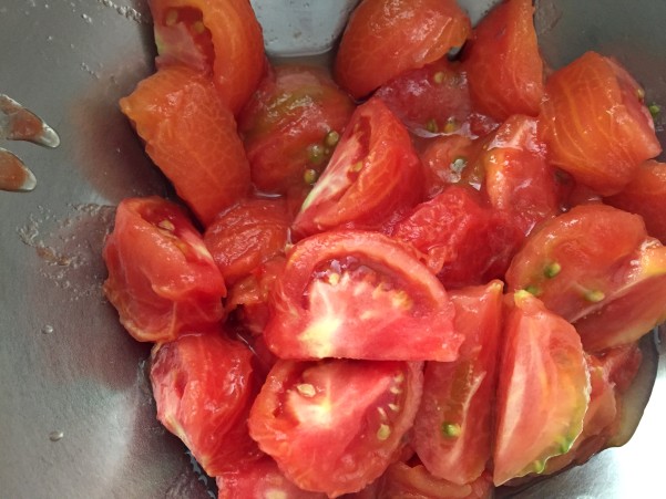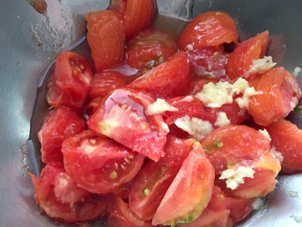 ②4等分したトマトをボウルに入れ すりおろしたにんにく 塩 レモン汁
