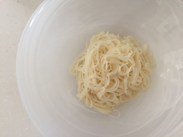 ④そうめんは茹でてから流水でよく洗い しぼるように水気をきりオリーブオイル