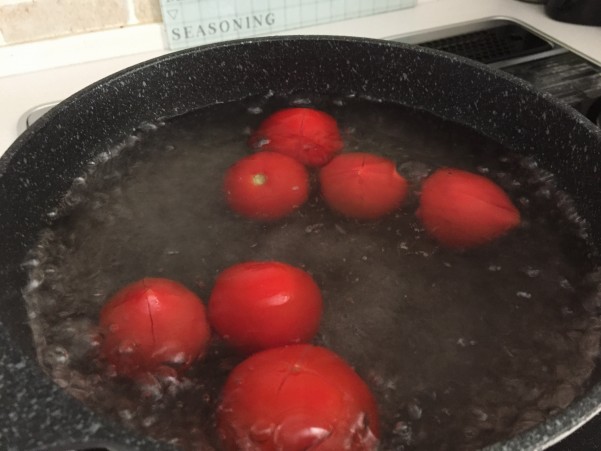 15~20秒ぐらい茹で冷水に入れ皮をむきます