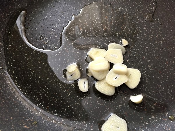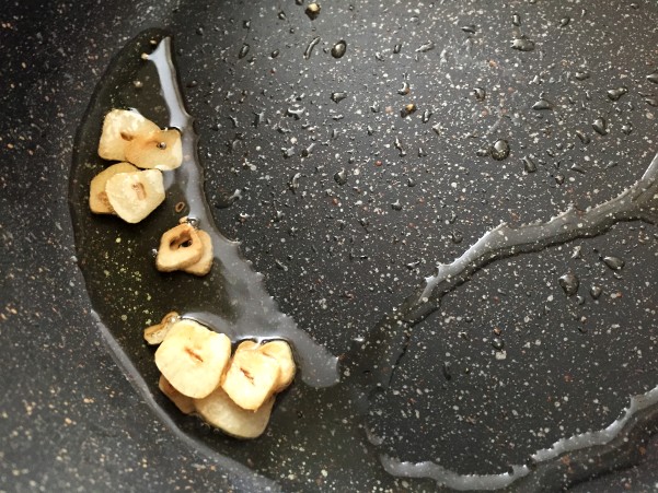 オイルで薄切りにんにくを 弱火でじっくり炒めます