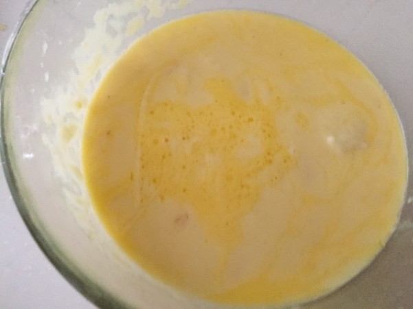 ⑤aのチーズと牛乳を耐熱皿に入れ600Wのレンジで1分半加熱してとかし