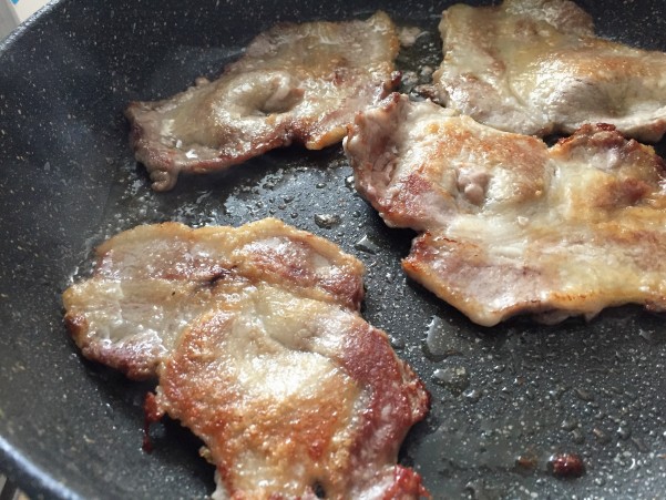 同じフライパンで スパイスをまぶした豚肉を入れ 中火で焼いていきます