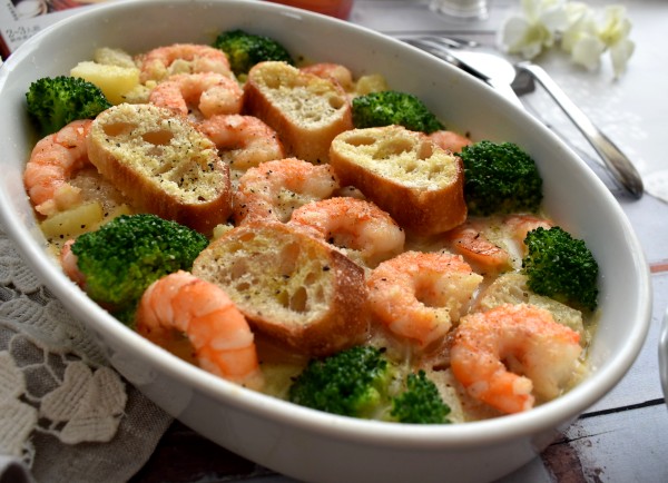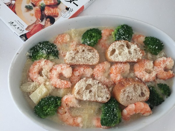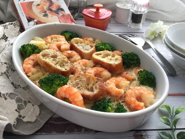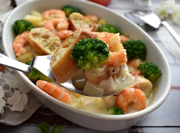 エビとバケットパンのクラムチャウダー風グラタンです