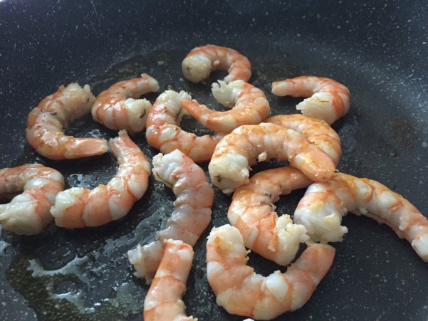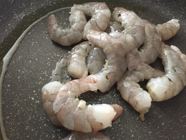 ①フライパンにオイルを入れ殻をむいたエビを入れさっと炒め取り出しておく