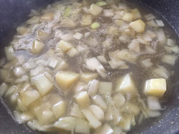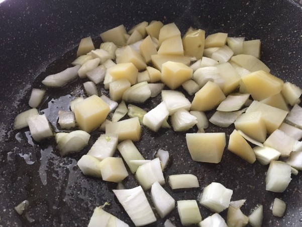 1,5cm角に切った玉ねぎとジャガイモを入れ炒めていきます