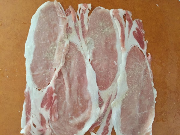 ③豚肉4枚を そうめんの長さに合わせて広げ 軽く塩・コショウする