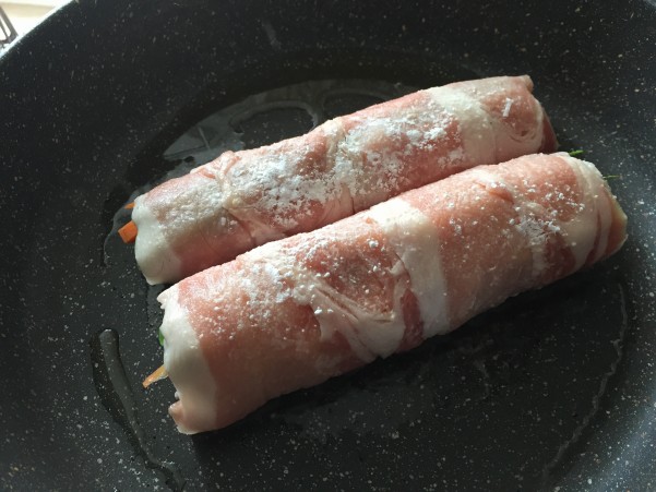 ⑤薄く小麦粉をふってオイルを入れたフライパンで巻き終わりの部分を下にして