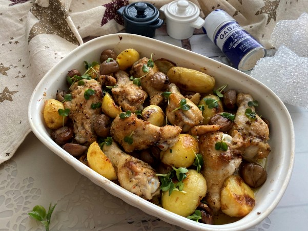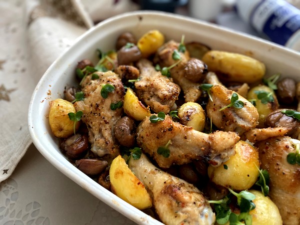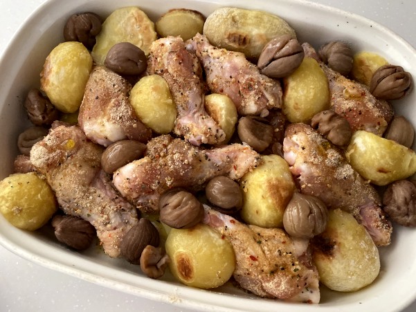 鶏手羽元と 栗とジャガイモを オーブンで焼いていきます