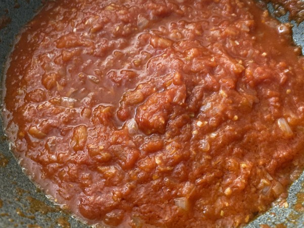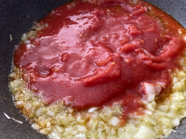 ②香りが出てしんなりしてきたらホールトマトを加え3~4分ぐらい煮込み