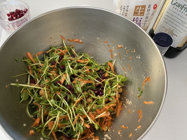 半分に切り 千切り人参 缶詰の豆苗 塩麹 オイルを加えます