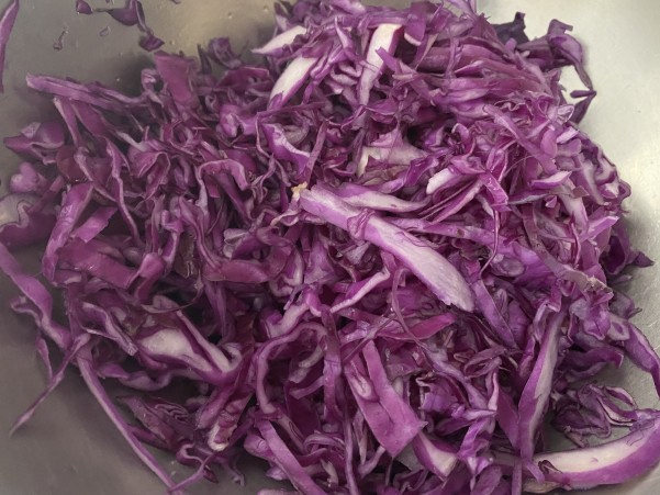 ①紫キャベツは大きめのせん切りに切り 塩をふって軽くもんで