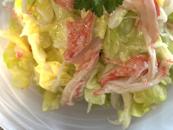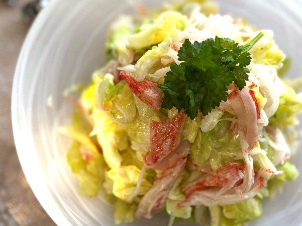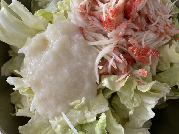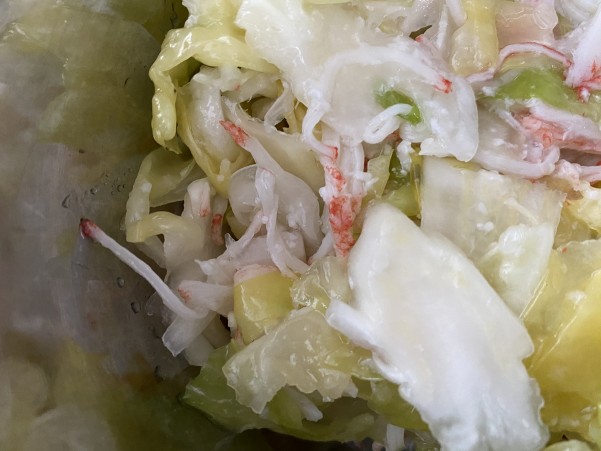 ほぐしたカニカマを加え塩麹とオイルを加える