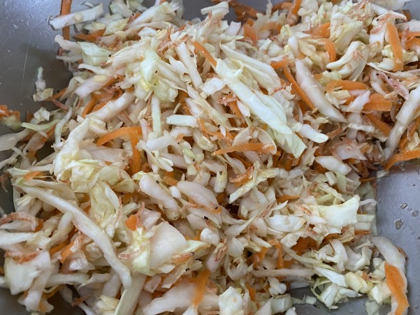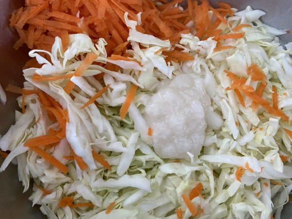 ①キャベツは少し太めのせん切りに 人参は野菜おろし器で