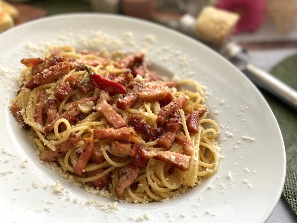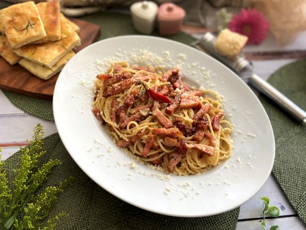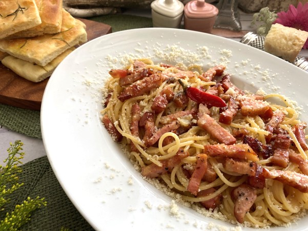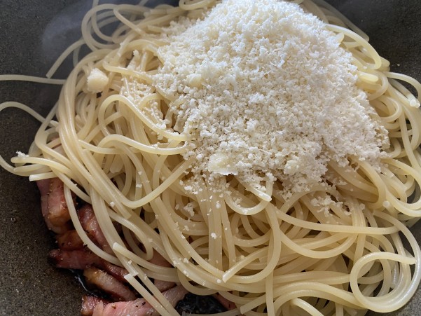 たっぷりのベーコンとパルミジャーノを和えたスパゲッティ