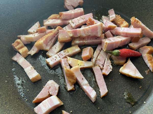 ②フライパンにオリーブオイルを入れ短冊に切ったベーコンに黒コショウを