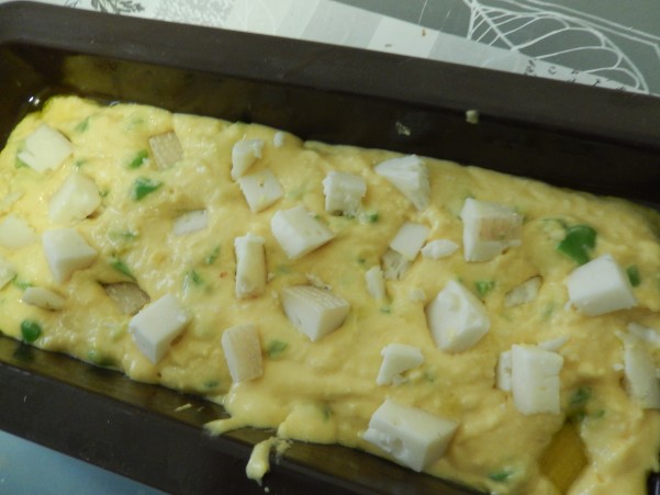 ④型に流し込み 上にぺコリーノと残しておいたそら豆をのせ
