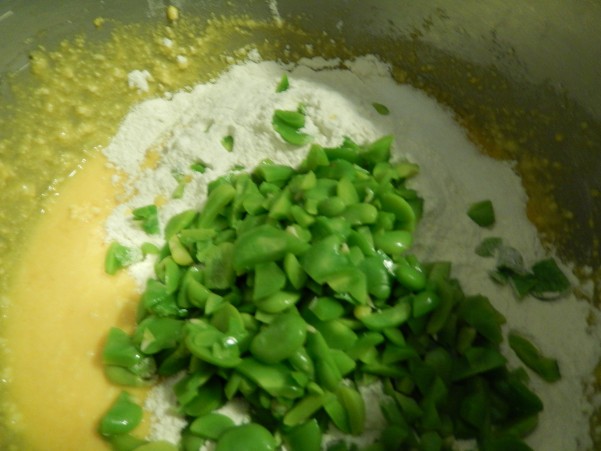 ふるった粉と ざく切りにしたそら豆を加え