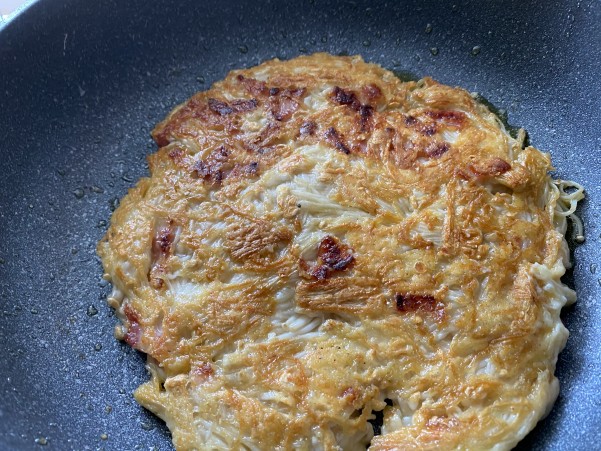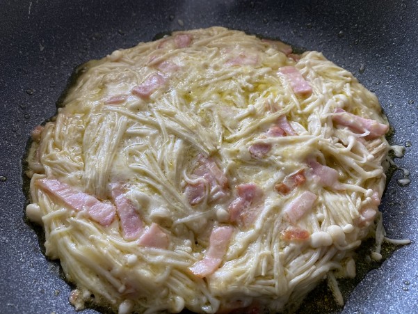 ③フライパンにオイルを入れ ②の混ぜ合わせたえのきを全体に広げ