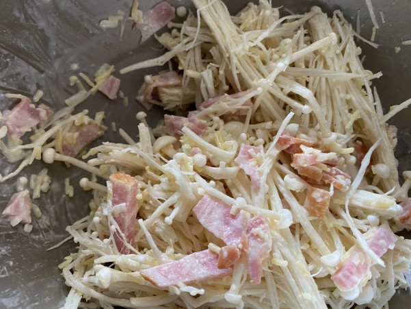 薄力粉と 小さく切ったベーコン 卵の代わりのつなぎは