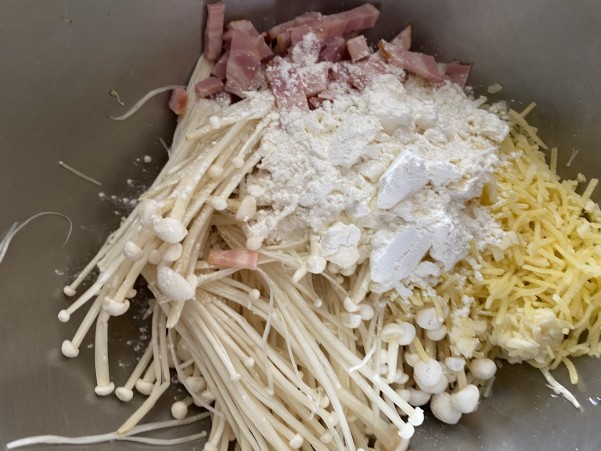 ②小さな角切りにしたベーコンとチーズ 小麦粉 水 塩を入れ