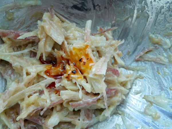 ③みょうがを加え 混ぜ合わせラー油をたらす