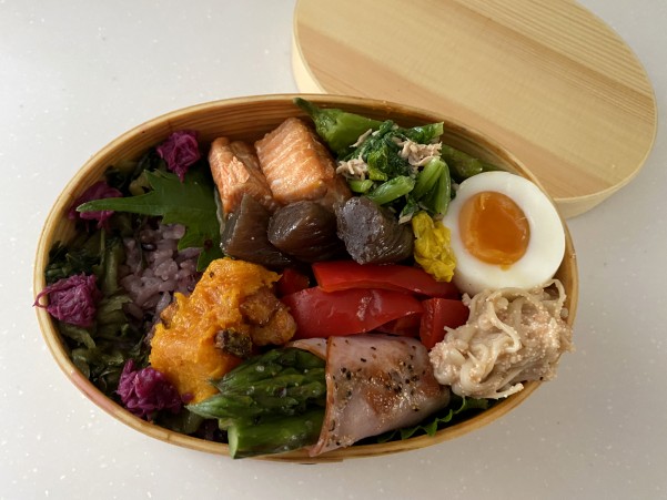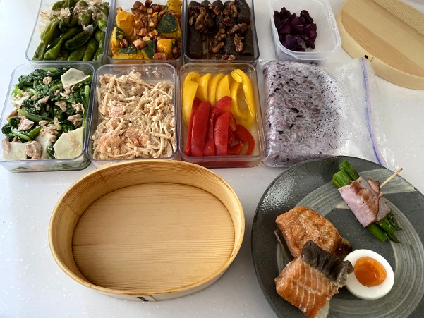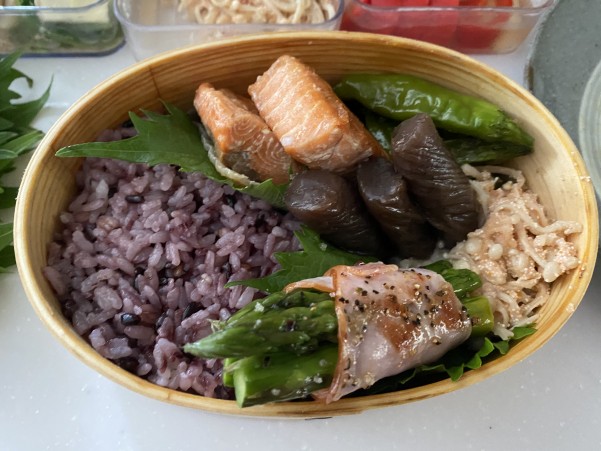 今日は 自己流ですがわっぱ弁当の詰め方を