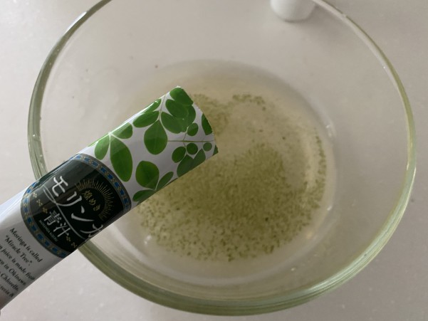 ②aの白だし 水 モリンガ青汁をよく混ぜ合わせる