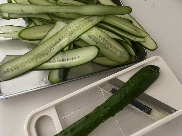 きゅうりは縦にスライサーで薄く切り