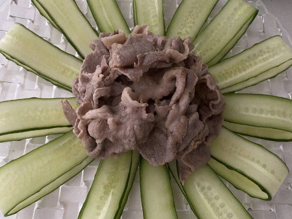 ④きゅうりを盛りつけた真ん中に 豚しゃぶ肉を盛りつけ