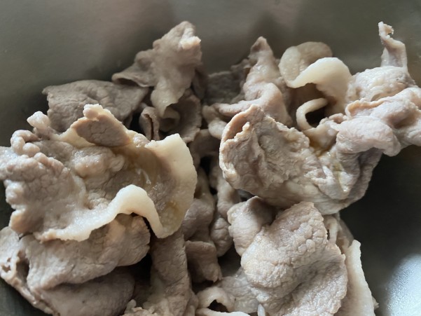 ③豚しゃぶ肉に薄く片栗粉をまぶし 熱湯で火を通し熱いうちに