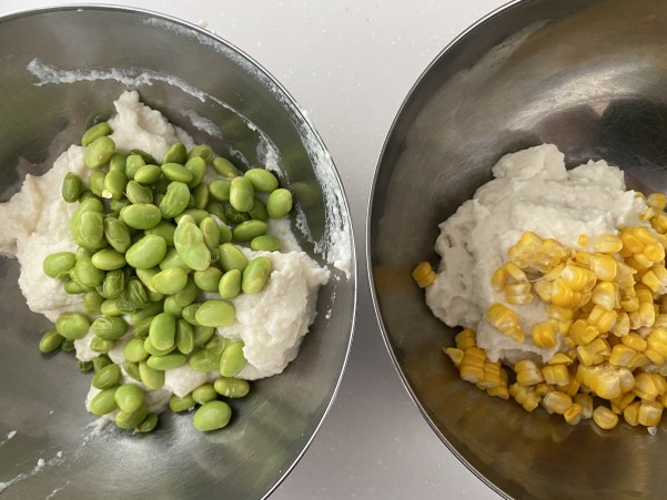 枝豆と とうもろこしをそれぞれ加え