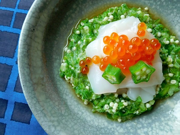 ④器に たたいたオクラをのせ 刺身用イカとイクラ