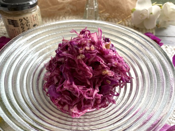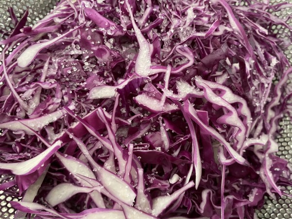 ①紫キャベツを千切りにして塩をふり軽くもみこむ